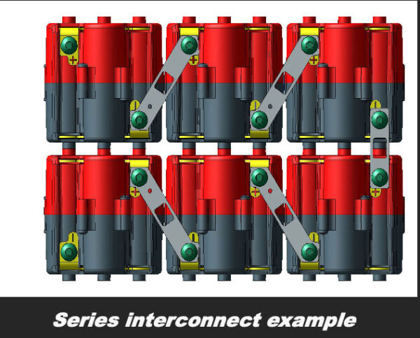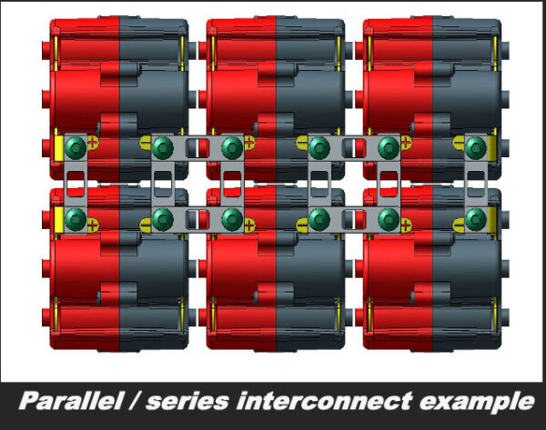 Building a battery with multiple EZ-Packs will require interconnects for the pack to pack connections. Your series/parallel layout will determine how many of each. The simplest and most common layout is a series connection between adjacent EZ-Packs. If it’s to be a single row of EZ-Packs, the long interconnect is all you’ll need. If your layout uses multiple rows, you will need a short interconnect for each crossover connection. There will always be one fewer interconnect than the number of EZ-Packs in a simple series connection scheme. In the above parallel/series example, note that all interconnects are short. If this layout is intended to deliver more current, then it may be a good idea to stack two for the series connection. Since the interconnects are fusible, it’s good to have some spares handy. If the interconnects get hot during use or change color, that’s an indication that suggests stacking two. The Fusible Interconnects are sold in packs of five.
